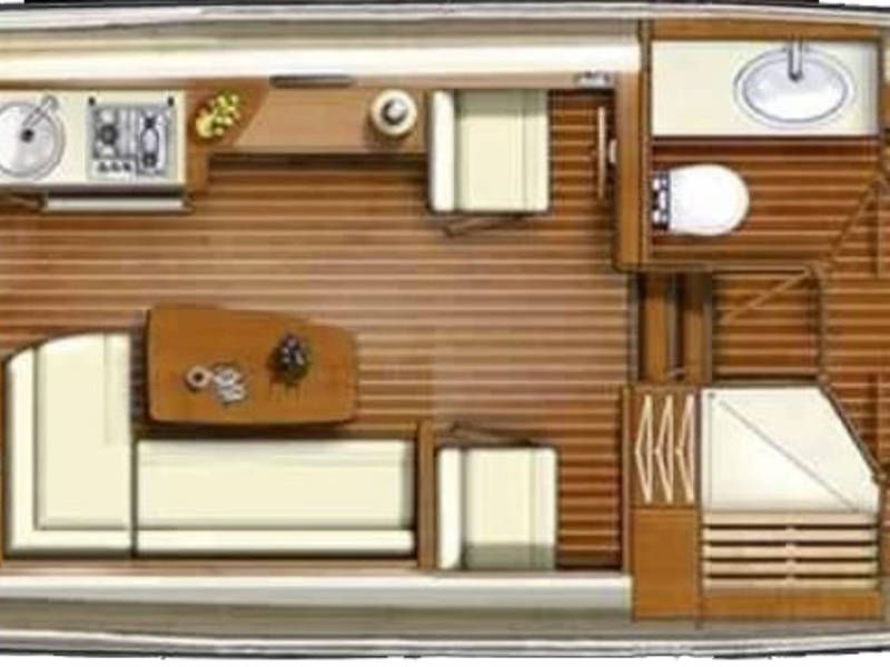 Die Küche dieser Yacht ist ausgestatten mit einem kompletten Inventar für 4 Personen: Kochtöpfe, Bratpfannen, Filterkaffee Apparat und Wasserkocher. Der Kühlschrank verfügt über einen inhalt von 85 Liter und ist vorsehen mit einem Gefrierfach. Der Herd besteht aus 3 Gaskochplatten.