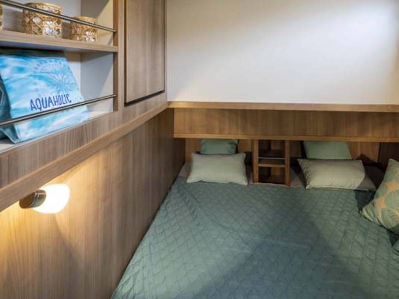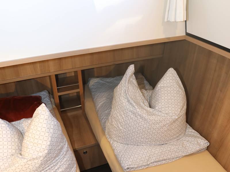 Eine Mittelkabine mit zwei Einzelbetten, die sich leicht zu einem vollwertigen Doppelbett verbinden lassen. Beide Kabinen verfügen über ausreichend Stauraum.