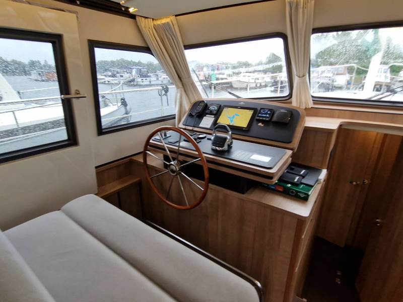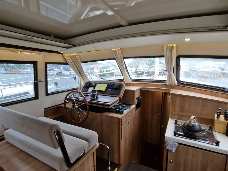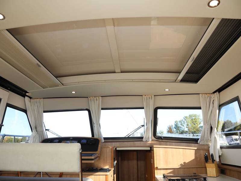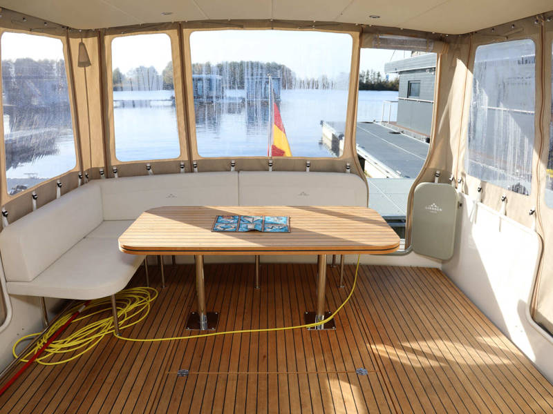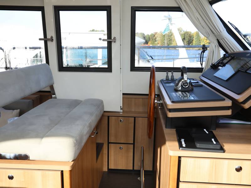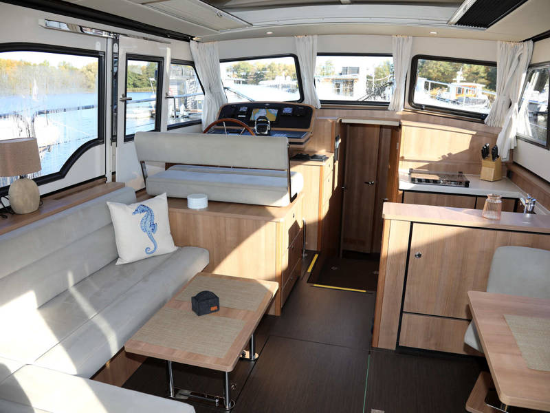Im Salon lässt sich das Dach elektrisch öffnen, wodurch ein echtes „Innen ist Außen“-Gefühl entsteht. Der Steuerstand ist mit einer breiten Sitzbank ausgestattet, sodass auch zu zweit gefahren werden kann. Außerdem gibt es an Steuerbord eine Schiebetür, die beim An- und Ablegen sowie zur Kommunikation sehr praktisch ist.