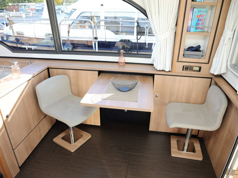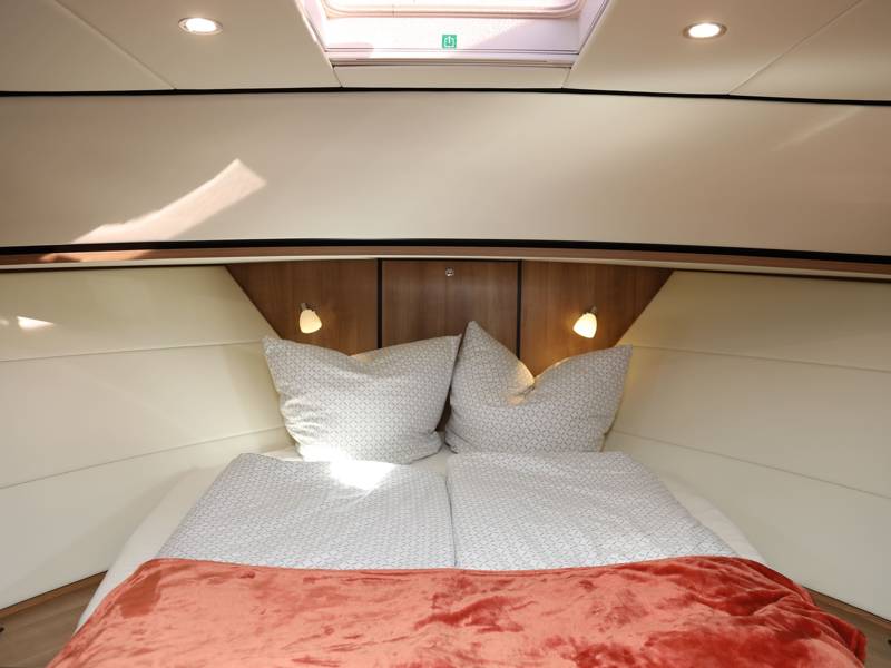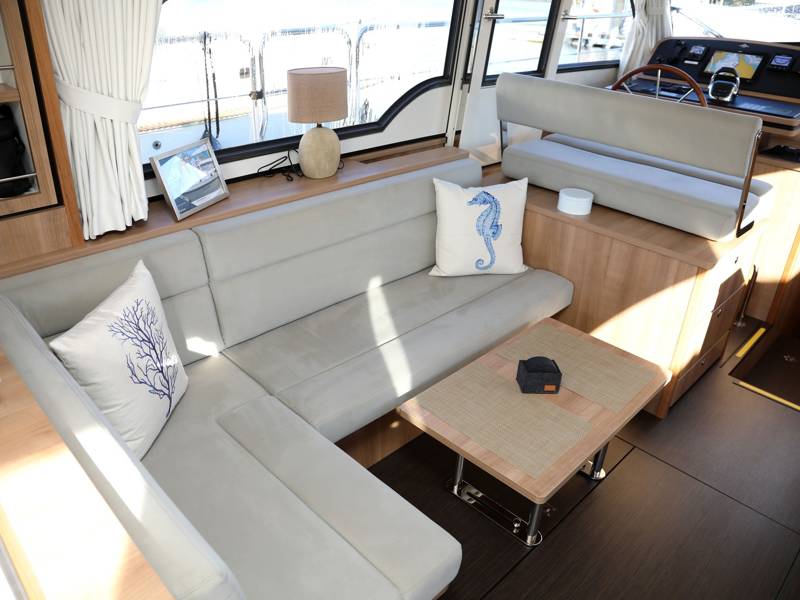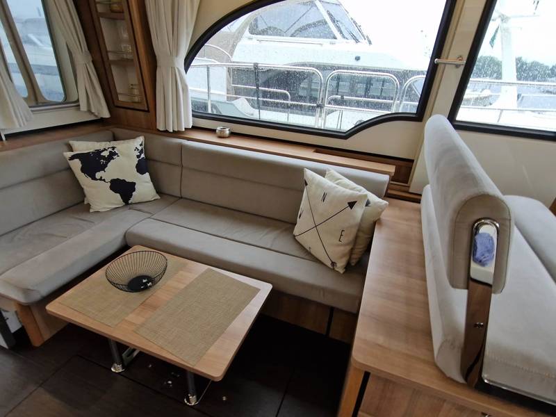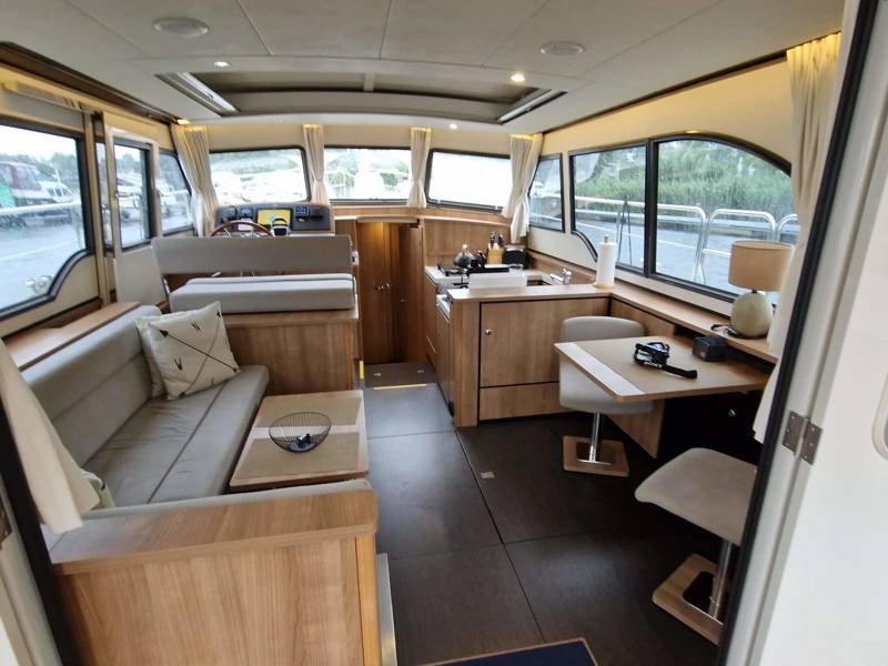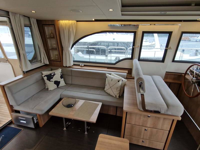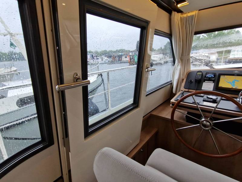 Im Salon lässt sich das Dach elektrisch öffnen, wodurch ein echtes „Innen ist Außen“-Gefühl entsteht. Der Steuerstand ist mit einer breiten Sitzbank ausgestattet, sodass auch zu zweit gefahren werden kann. Außerdem gibt es an Steuerbord eine Schiebetür, die beim An- und Ablegen sowie zur Kommunikation sehr praktisch ist.