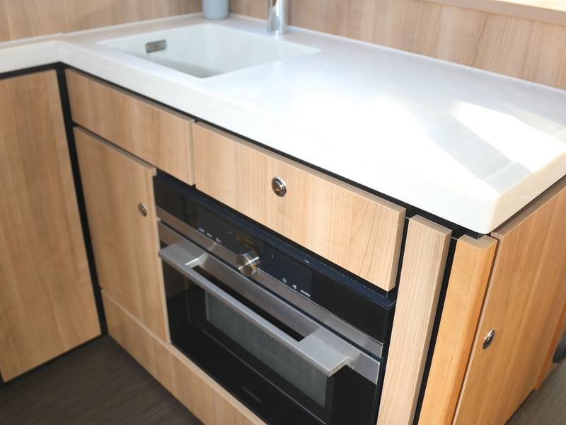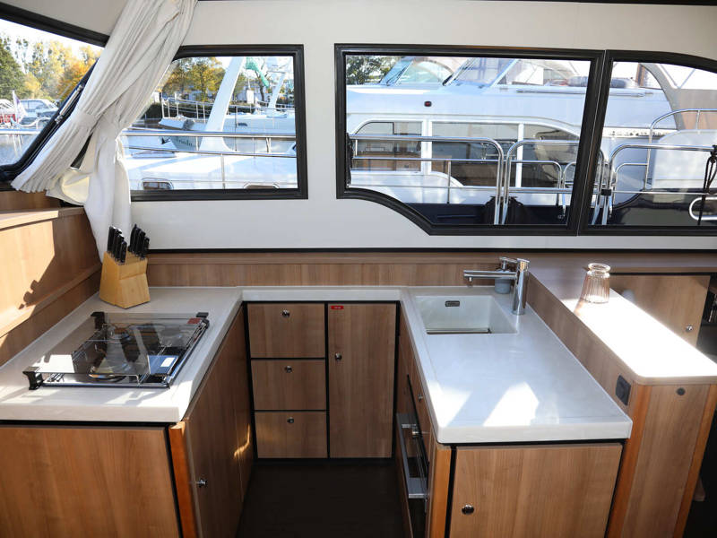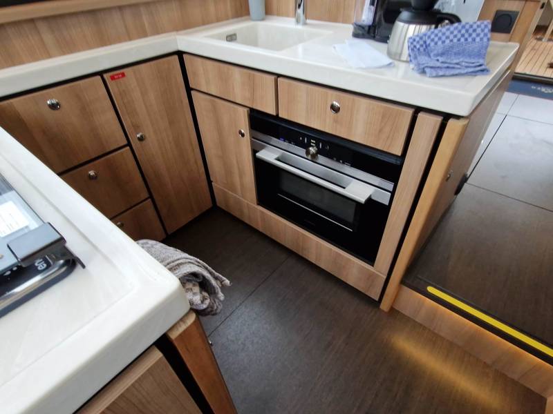 Die Küche ist vollständig für 4 bis 6 Personen ausgestattet, unter anderem mit Kaffeemaschine und Nespresso-Maschine, großem Kühlschrank mit Gefrierfach, 3-flammigem Gasherd, Backofen – alles, was man für einen gelungenen Bootsurlaub benötigt.