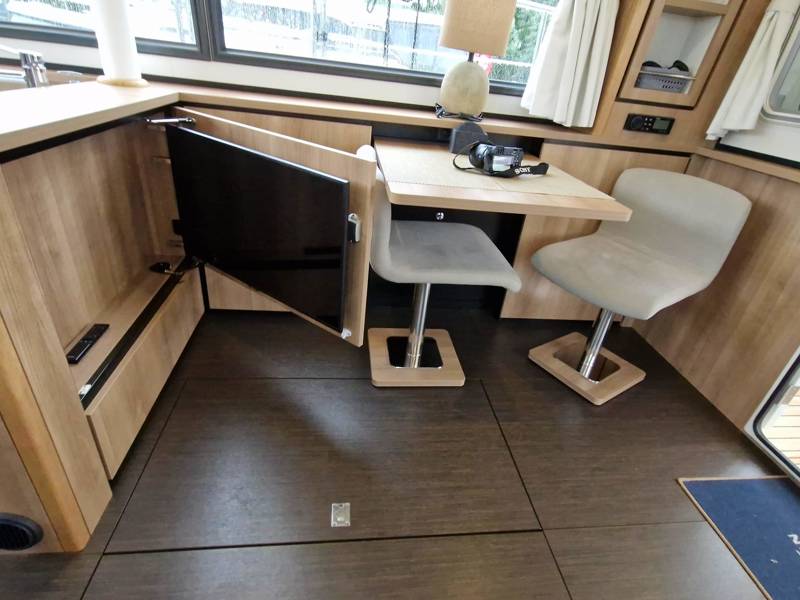 Ein eingebautes Audiosystem sowie ein elegant integrierter Fernseher mit Google-TV-Dongle befinden sich ebenfalls an Bord dieser fantastischen Yacht.