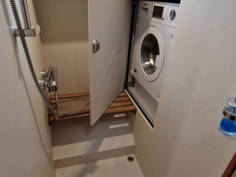 Das Schiff verfügt über ein großes Solarpaket und eine Wasch-Trockner-Kombination, was es auch für längere Fahrten ideal macht.