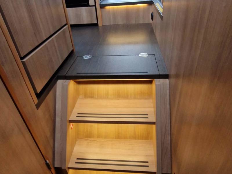 Der Salon verfügt über eine gemütliche L-förmige Rundsitzgruppe. Dieses Sofa kann optional zu einem Easy-Sleep-System ausgezogen werden und bietet so eine dritte Schlafmöglichkeit.