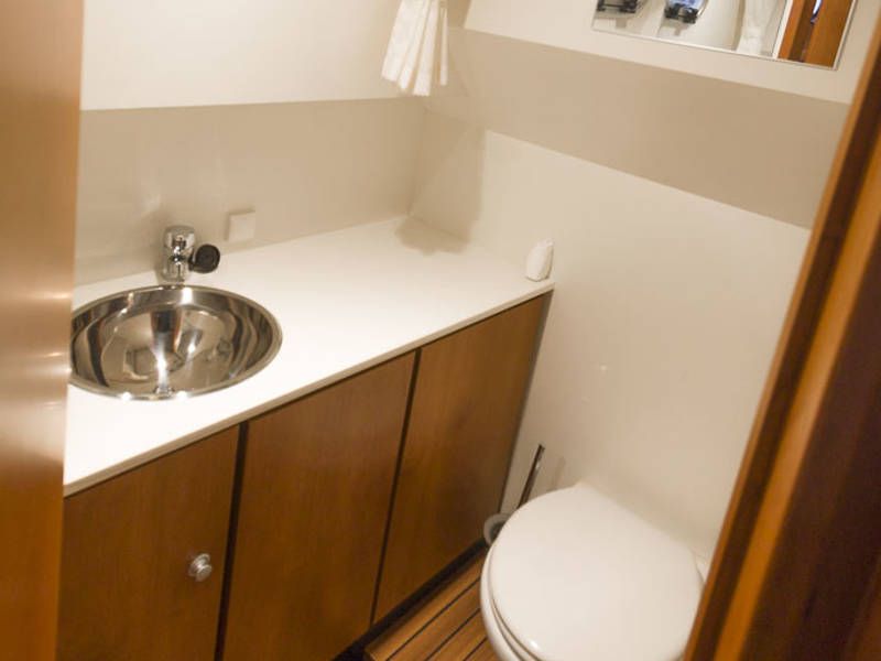 Die Kajüte hat eine Stehhöhe von 1,95 m. Der Salon verfügt über eine geräumige Sitzecke mit Lederpolsterung (die Sitzecke lässt sich in einen zweiten Schlafplatz verwandeln).